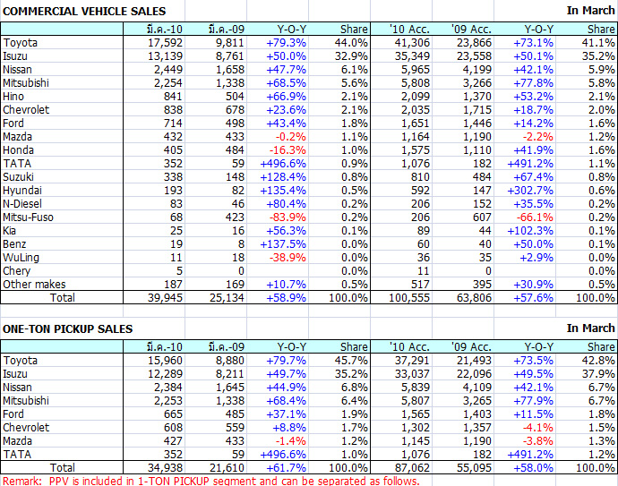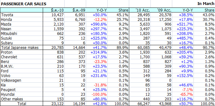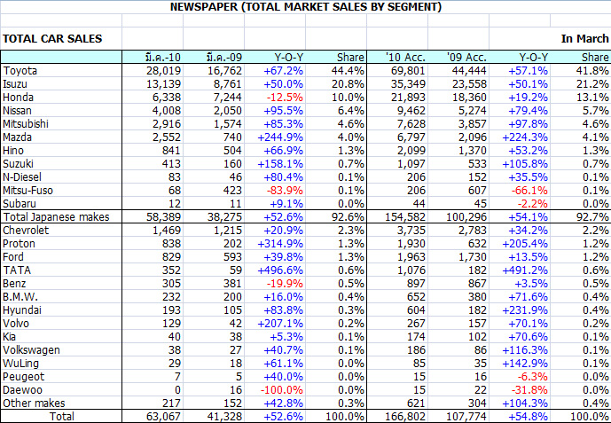 บริษัท โตโยต้า มอเตอร์ ประเทศไทย จำกัด รายงานสถิติการขายรถยนต์เดือนมีนาคม 2553