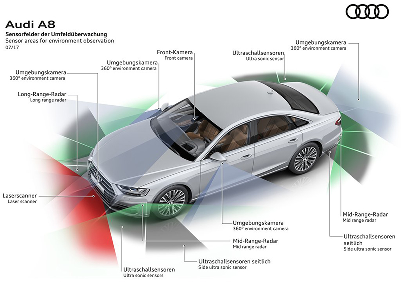 ระบบช่วยเหลือขับขี่กึ่งอัตโนมัติ Audi AI รองรับการขับขี่อัตโนมัติภายใต้การจราจรที่ติดขัด รองรับการทำงานอัตโนมัติภายใต้ความเร็วสูงสุดไม่เกิน 60 กิโลเมตรต่อชั่วโมง สามารถทำงานได้ภายใต้บนทางด่วนหรือถนนปกติทั่วไป ผู้ขับขี่ไม่ต้องพะวงหน้าพะวงหลังอีกต่อไป เพราะระบบจะทำงานให้อัตโนมัติทั้งการออกจากจุดสตาร์ท, การเร่ง, การเบรกและการบังคับพวงมาลัย โดยที่ผู้ขับขี่ไม่จำเป็นต้องคอยจับพวงมาลัยตลอดเวลา