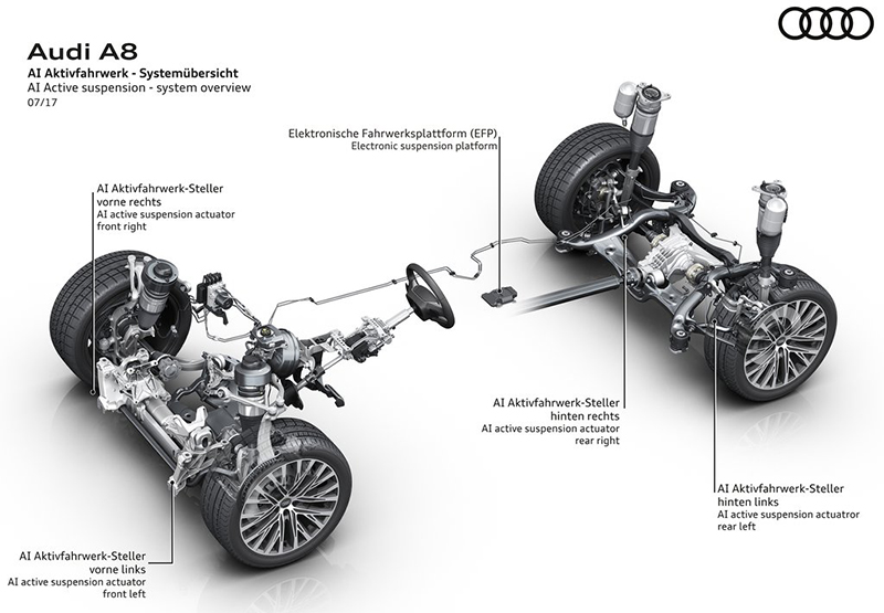 นวัตกรรมช่วงล่างใหม่ล่าสุด Audi AI Active Suspension ช่วงล่างที่สามารถปรับตัวได้ทุกสภาวะสมบูรณ์แบบเพื่อความมั่นคงขณะขับขี่ ช่วงล่างในแต่ละล้อสามารถยกตัวหรือหดตัวได้อย่างอิสระโดยมีจุดมุ่งหมายเพื่อสร้างความสบายขณะขับขี่ไปจนถึงการขับขี่แบบสปอร์ตได้ด้วยแบบไร้ข้อแม้