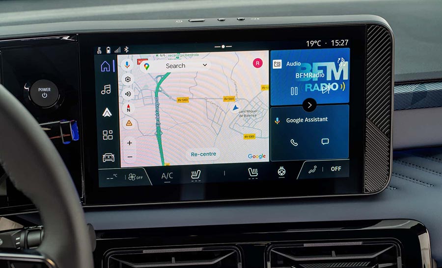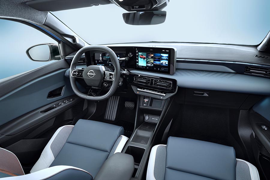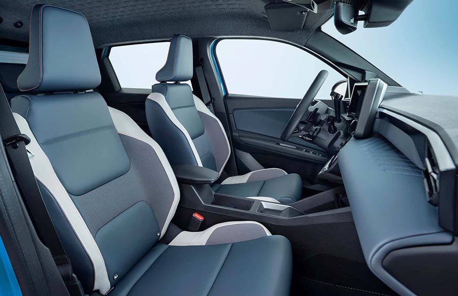 ภายในห้องโดยสาร ใช้งานออกแบบเหมือนกันกับ Renault 5 และ Renault 4 E-Tech แต่ปรับการตกแต่งให้ต่างออกไป วัสดุเบาะนั่ง แผงแดชบอร์ดด้านหน้า และแผงด้านข้างประตู ใช้เป็นหนังสังเคราะห์สีเทาฟ้า ตัดกับวัสดุผ้าสีเทา มีการใช้ไฟ Ambient Light 48 เฉดสี เข้ามาสร้างความหลากหลายของบรรยากาศในยามคำ่คืน ด้านพื้นที่เก็บสัมภาระด้านหลัง มีขนาด 326 ลิตร และเมื่อพับเบาะนั่งด้านหลังแบบ 60 : 40 ให้ราบลง จะได้พื้นที่เพิ่มเป็น 1,106 ลิตร
