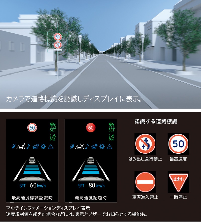 - ระบอ่านป้ายจราจรเพื่อควบคุมความเร็ว, สั่งหยุด, ห้ามเข้าและเตือนเมื่อพบเครื่องหมายห้ามแซง Road Sign Assist