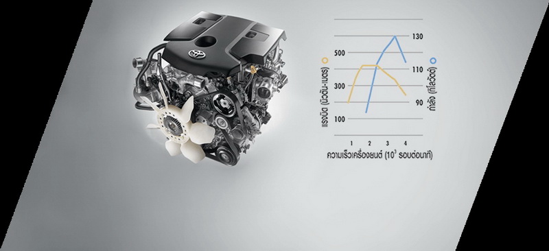 ติดตั้งเครื่องยนต์ดีเซล 2GD-FTV (High) 4 สูบ แถวเรียง 16 วาล์ว DOHC VN Turbo และ Intercooler หัวฉีดไดเร็คอินเจคชั่น แบบคอมมอนเรล ขนาด 2.4 ลิตร 2,393 ซีซี. กระบอกสูบ x ระยะชัก 92.0 x 90.0 มิลลิเมตร อัตราส่วนกำลังอัด 15.6 : 1 กำลังสูงสุด 150 แรงม้า (PS) ที่ 3,400 รอบต่อนาที แรงบิดสูงสุด 400 นิวตันเมตรที่ 1,600 – 2,000 รอบต่อนาที จับคู่เกียร์อัตโนมัติ 6 จังหว ะและ ระบบขับเคลื่อน 4 ล้อแบบ Part-Time