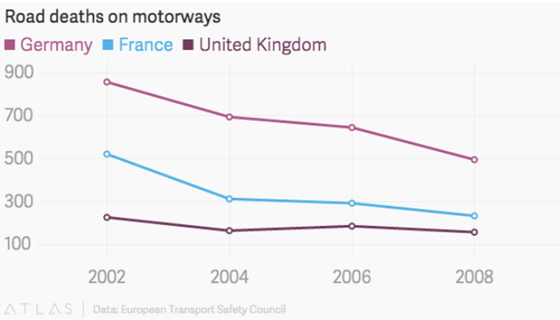 รถยนต์ที่มีคนเสียชีวิตเกิดขึ้นบนทางหลวงที่ไม่มีการจำกัดความเร็ว ซึ่งในประเทศนี้มีถนนหลวงที่จำกัดความเร็ว