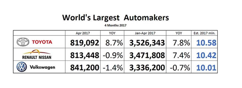 จากการรายงานยอดขายรถยนต์ตั้งแต่เดือนมกราคม-เมษายน 2017 ทั่วโลกที่รวบรวมโดย JATO Dynamics พบว่า Volkswagen ยังคงครองยอดขายอันดับ 1 ของโลกด้วยตัวเลข 3.32 ล้านคัน ตามมาด้วย Toyota ที่มียอดขาย 3.06 ล้านคันและ Renault-Nissan Alliance มียอดขาย 3.02 ล้านคัน