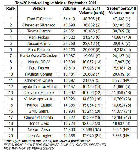 ยอดขายรถยนต์สหรัฐอเมริกา 20 อันดับประจำเดือนกันยายน 2011
