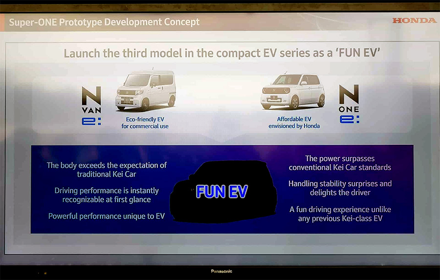 อีกทั้งในช่วงนี้ Honda กำลังพยายาม โปรโมท รถยนต์ขุมพลังไฟฟ้าของตน ไม่ว่าจะเป็นการนำร่องด้วย N:VAN e รถตู้ ขนาดเล็กพลังไฟฟ้า เบาะพับเรียบและเป็นพื้นห้องโดยสารได้ แถมยังอเนกประสงค์มากๆ อีกด้วย ตามมาด้วย Honda N-ONE e เวอร์ชันไฟฟ้าล้วน ของ K-Car ทรง Hatchback ที่เป็นการนำ N ONE 660 ซีซี รุ่นปกติ มาเปลี่ยนขุมพลัง และปรับจูนรถใหม่ ให้ใช้ไฟฟ้าล้วนๆ Honda เลยมองว่า พวกเขาควรสร้าง FUN EV อีกสักคัน ที่ขับสนุกขึ้น แม้จะเป็น EV ด้วยแนวทางต่อไปนี้