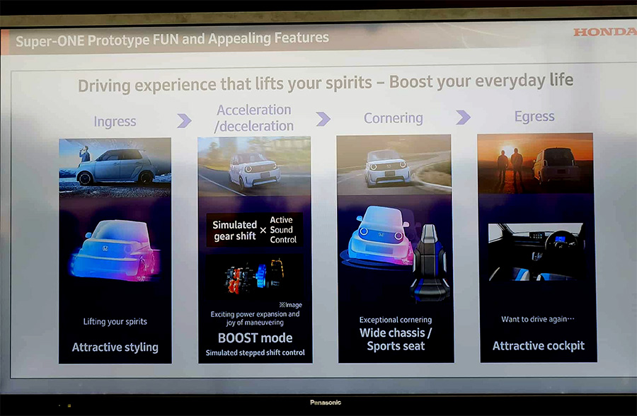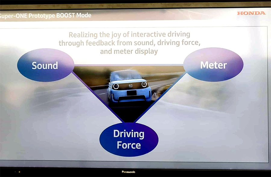 Super-ONE Prototype มาพร้อมแนวคิด “e: Dash BOOSTER” ที่มุ่งเปลี่ยนการเดินทางในชีวิตประจำวันให้กลายเป็นประสบการณ์ที่สนุก ตื่นเต้น และเร้าใจมากขึ้น แม้ว่าตอนแรก มีแนวคิดจะตั้งชื่อ BULLDOG เพื่อระลึกถึง Honda CITY TURBO-II BULLDOG ที่เคยโด่งดังในญี่ปุ่นช่วงปี 1983 – 1985 แต่สุดท้าย ทีมวิศวกรเลือกใช้ชื่อ “Super-ONE” เพื่อสื่อถึงความตั้งใจของ Honda ที่ต้องการสร้างรถยนต์ที่มอบคุณค่าเฉพาะตัวแบบ “One and Only” และ “Super” ที่ก้าวข้ามขอบเขตและมาตรฐานเดิมของรถ BEV เพื่อมอบความตื่นเต้นรูปแบบใหม่ในทุกการขับขี่ ภายใต้คอนเซ็ปต์ที่ผสมผสานความเป็นมิตรต่อสิ่งแวดล้อม เข้ากับความสนุกในการขับขี่อันเป็นเอกลักษณ์ของ Honda
