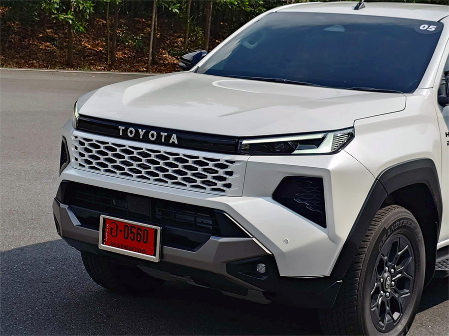 ชิ้นส่วนตัวถังด้านหน้า ออกแบบขึ้นใหม่ทั้งหมด ชุดไฟหน้า LED พร้อม ไฟส่องสว่างขณะขับขี่ช่วงกลางวัน Daytime Running Light เชื่อมต่อชุดไฟหน้าทั้ง 2 ฝั่ง ด้วยแถบพลาสติกพร้อมสัญลักษณ์ตัวอักษร TOYOTA นับเป็นครั้งแรกในรอบหลายปี ที่ทีมออกแบบ ถอดสัญลักษณ์ 3 ห่วง ออกจากรถกระบะ รุ่นมาตรฐาน ในเมืองไทย (ไม่นับพวกรุ่น GR Sport หรือ TRD ในอเมริกาเหนือ)
