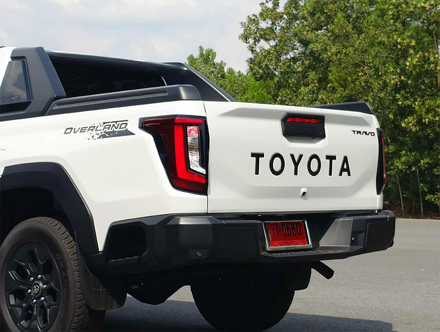 นอกจากนี้ ยังมีตัวอักษร TOYOTA ขนาดใหญ่ แปะเพิ่มมาให้ กลางฝาท้าย แม้จะดูคล้ายรถกระบะยุค Hilux Hero หรือ Mighty-X แต่ ถ้าลูกค้าซื้อรถสีสว่าง ตัวอักษรจะเป็นสีดำ แต่ถ้าซื้อรถสีดำ ตัวอักษรจะเป็นสีเทา เหตุที่ต้องทำเช่นนี้ เพื่อให้ทุกประเทศในโลก มีฝาท้ายเหมือนกัน ซึ่งช่วยประหยัดต้นทุนการปั้มชิ้นส่วนไปได้อีกมากโข (ฮา)