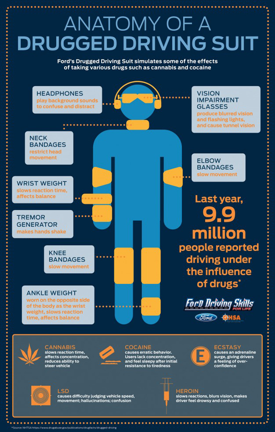 เครื่องมือที่ว่านี้มีชื่อว่า Ford Drug Driving Suit ซึ่งไม่ได้ลักษณะเหมือนชุดหมีของนักอวกาศแต่มีเพียงแว่นตา, หูฟัง,