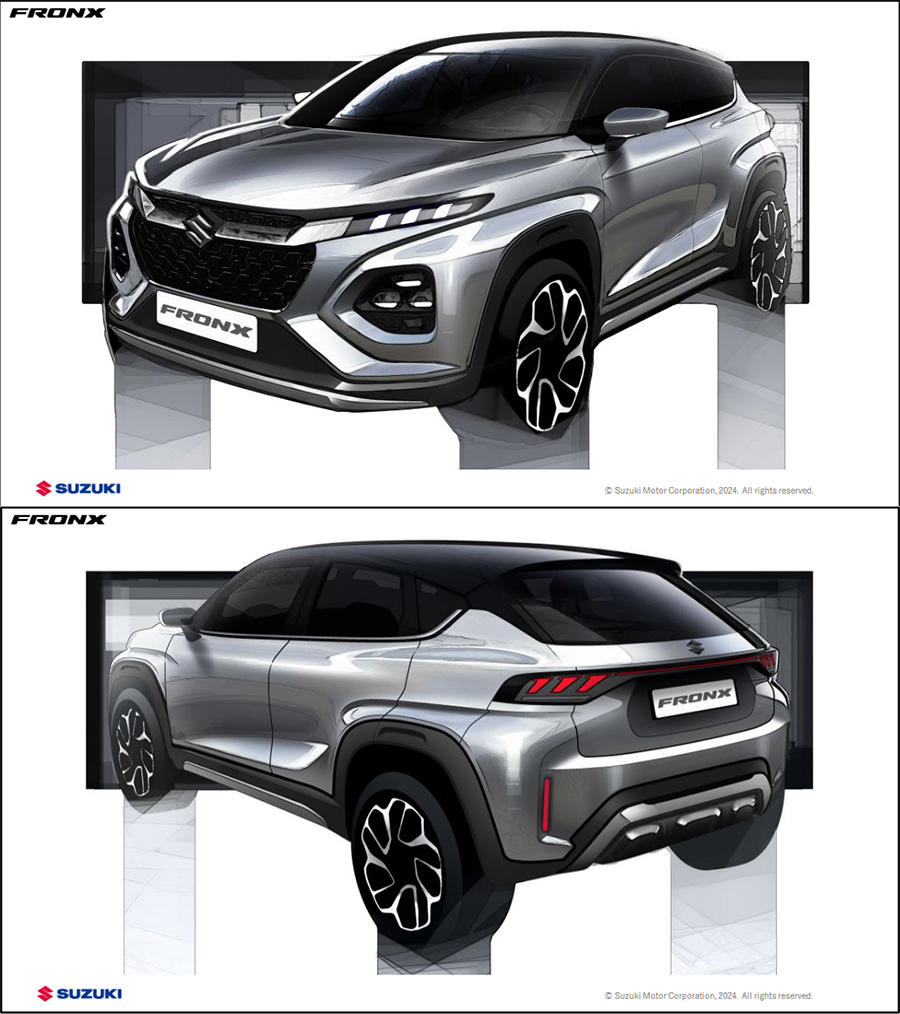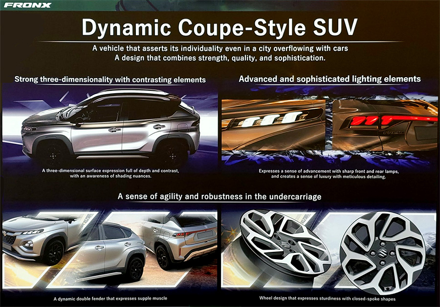 ความตั้งใจทำ Fronx คือให้มีความยาวสั้นกว่า 4 เมตร แต่ต้องออกแบบให้กว้างระดับหนึ่ง ซึ่งนักออกแบบของค่ายคุ้นเคยกับ Kei-Car ที่มีข้อจำกัดต่าง ๆ อยู่แล้ว ทว่า ครั้งนี้ไม่ได้ตั้งข้อจำกัดอะไร เพียงแต่ให้ทีมออกแบบ ร่างภาพ Design Sketch ตามแนวคิด “มีพลัง พลิ้วไหวและโดดเด่น” เรื่องความกว้างในตอนท้ายที่สุดแล้วจะกว้างกว่าที่จินตนาการไว้เล็กน้อยแต่เรื่องรัศมีวงเลี้ยวแคบสุด ฯ ถือว่าอยู่ในจุดสมดุลดีอยู่ และที่อินเดียก็ไม่ได้มีใครพูดถึงเรื่องความกว้าง