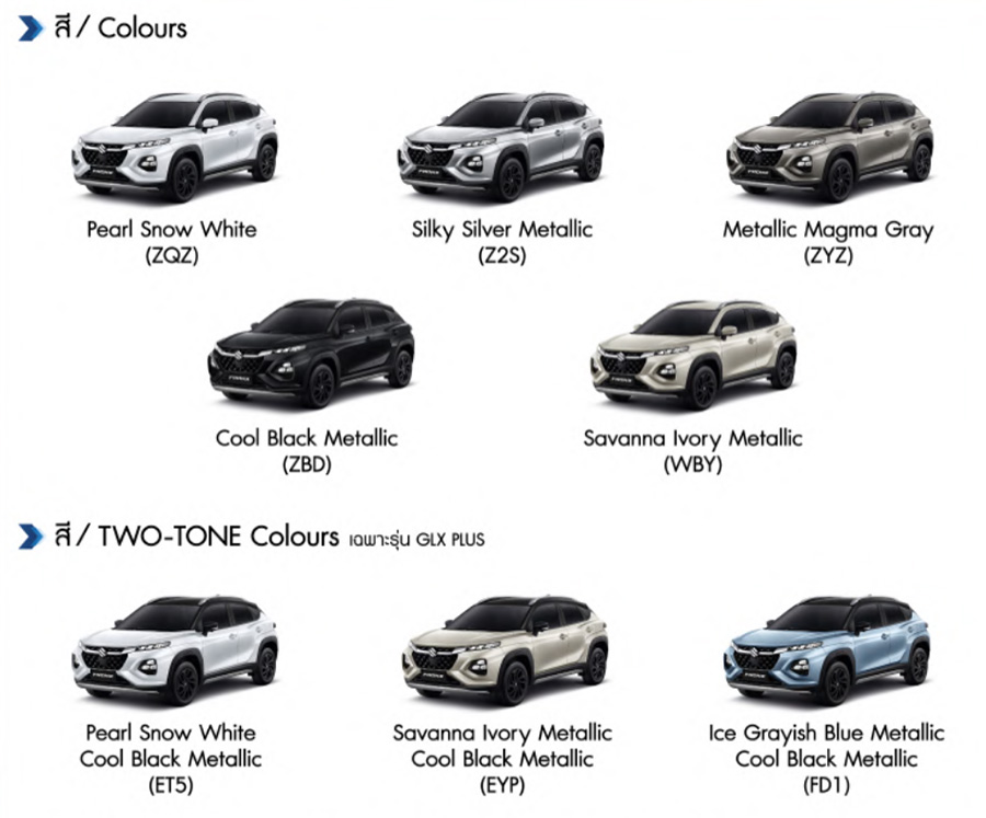 สำหรับตลาดเมืองไทย FRONX มีทางเลือก 3 รุ่นย่อย เหมือนกับตลาด Indonesia ไม่ผิดเพี้ยน และ Option ส่วนใหญ่ จะเหมือนกันหมด ราคาจำหน่าย แต่ละรุ่นย่อย ต่างกันรุ่นละ 50,000 บาท มีดังนี้