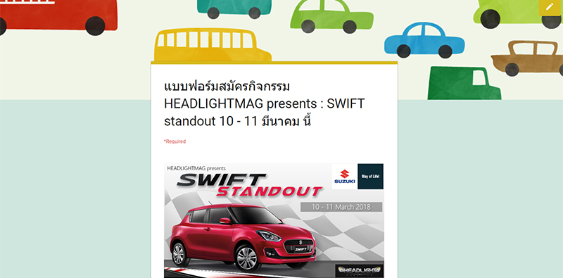 กลับมาอีกครั้งกับกิจกรรมทดลองขับรถยนต์รุ่นใหม่ล่าสุดอย่าง NEW Suzuki Swift ที่เปิดตัวไปเมื่อ 8 กุมภาพันธ์ ที่ผ่านมา รอบนี้ Suzuki Motor Thailand ร่วมกับ Headlightmag.com จัดกิจกรรม HEADLIGHTMAG presents : SWIFT standout ให้คุณผู้อ่านได้ลองขับรถในสนามปิด ทดสอบสมรรถนะด้วยตนเอง