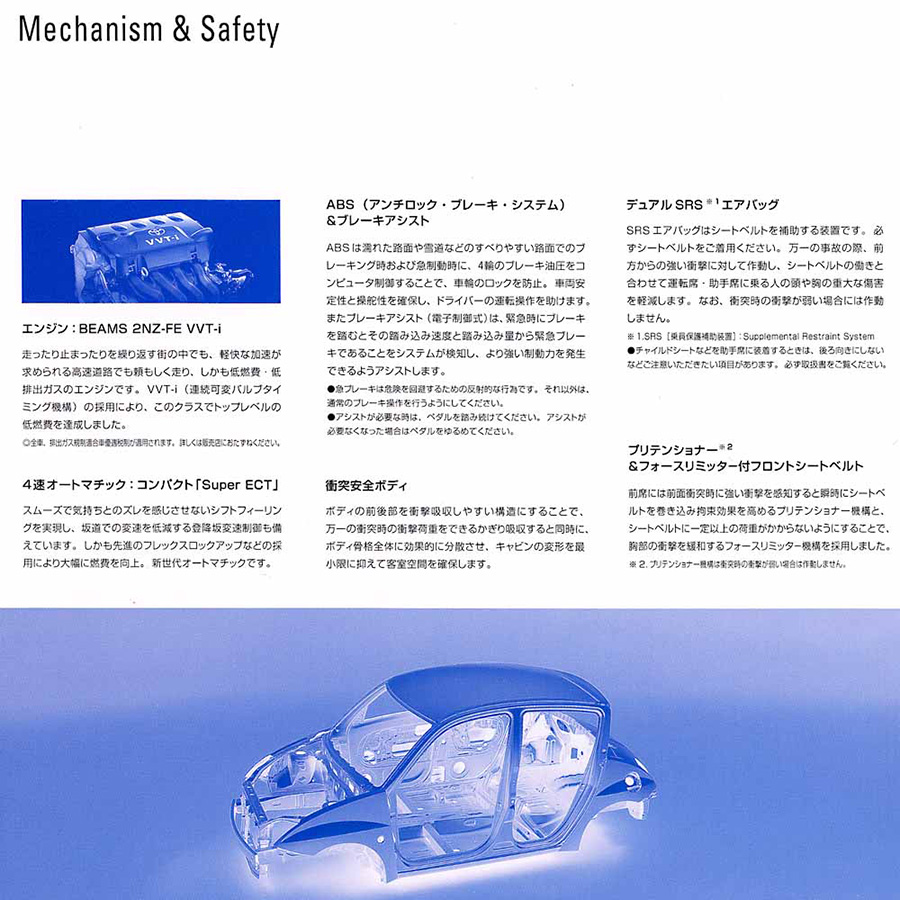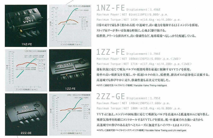 • รุ่น 1.3 ลิตร FWD : วางเครื่องยนต์ รหัส 2NF-FE เบนซิน 4 สูบ DOHC 16 วาล์ว 1,298 ซีซี กระบอกสูบ x ช่วงชัก 75 x 73.5 มิลลิเมตร กำลังอัด 10.5 : 1 จ่ายเชื้อเพลิงด้วย หัวฉีดอีเล็กโทรนิคส์ EFI พร้อมระบบแปรผันวาล์วที่หัวแคมชาฟต์ VVT-i กำลังสูงสุด 87 แรงม้า (PS) ที่ 6,000 รอบ/นาที แรงบิดสูงสุด 12.3 กก.-ม. ที่ 4,400 รอบ/นาที ขับเคลื่อนล้อหน้าด้วยเกียร์อัตโนมัติ 4 จังหวะ Super ECT อัตราสิ้นเปลืองเชื้อเพลิงเฉลี่ยตามมาตรฐานทดสอบ 10 – 15 Mode ของรัฐบาลญี่ปุ่น 18.0 กิโลเมตร/ลิตร