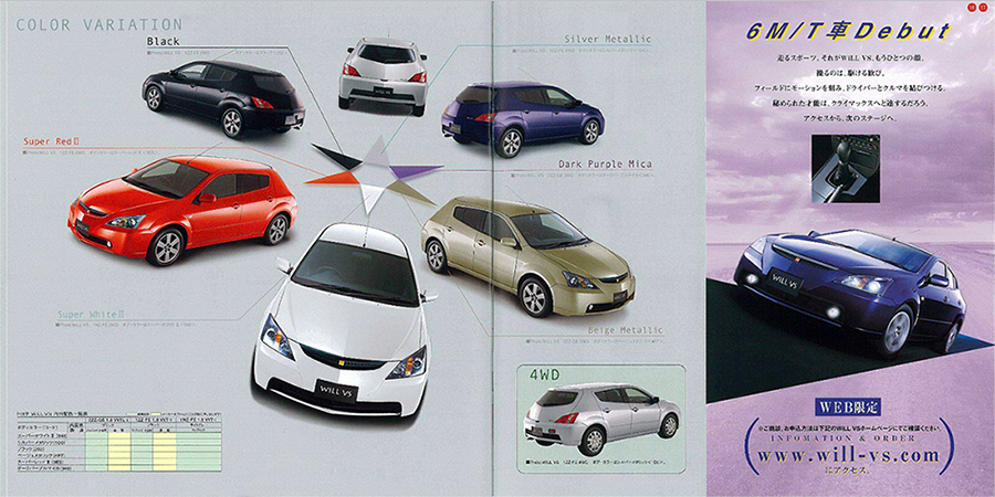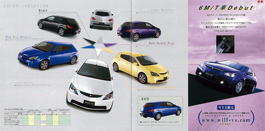 30 กรกฎาคม 2002 : Toyota เพิ่มรุ่นย่อยพิเศษ WiLL VS “White Pearl Limited” บนพื้นฐานจากรุ่น เบนซิน 1.5 ลิตร เกียร์อัตโนมัติ 4 จังหวะ ใช้สีตัวถัง White Pearl Mica รวมทั้งตกแต่ง แผงประตู Door Trim และ แผง Trim ฝาท้าย ด้วยสีขาว ออกสู่ตลาดในราคา 1,498,000 เยน โดยจำกัดการผลิตไว้เพียง 2 เดือน สามารถสั่งซื้อได้ ผ่านทาง Website willshop.com และโชว์รูมเครือข่ายจำหน่าย VISTA จนถึง 30 กันยายน 2002 เท่านั้น