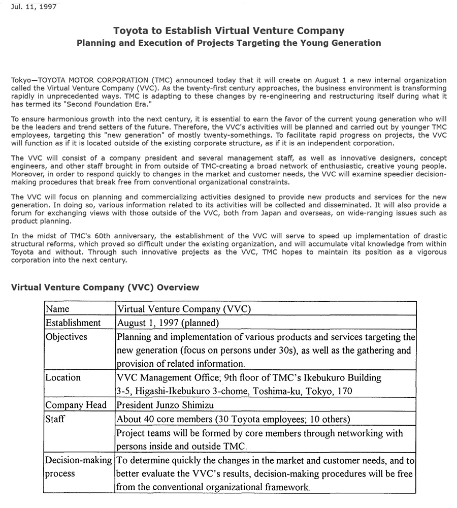 ด้วยเหตุและปัจจัยทั้งหมดนี้ Toyota จึงแถลงข่าวออกมา เมื่อวันที่ 11 กรกฎาคม 1997 ว่าพวกเขาจะก่อตั้ง หน่วยงานใหม่ ในชื่อ Virtual Venture Company (VVC) โดยจดทะเบียนอย่างเป็นทางการเมื่อวันที่ 1 สิงหาคม 1997 เพื่อเสริมสร้างการพัฒนาผลิตภัณฑ์และบริการที่มุ่งเป้าไปที่กลุ่มคนรุ่นใหม่ในช่วงอายุ 20-30 ปี