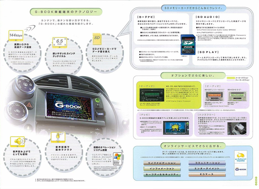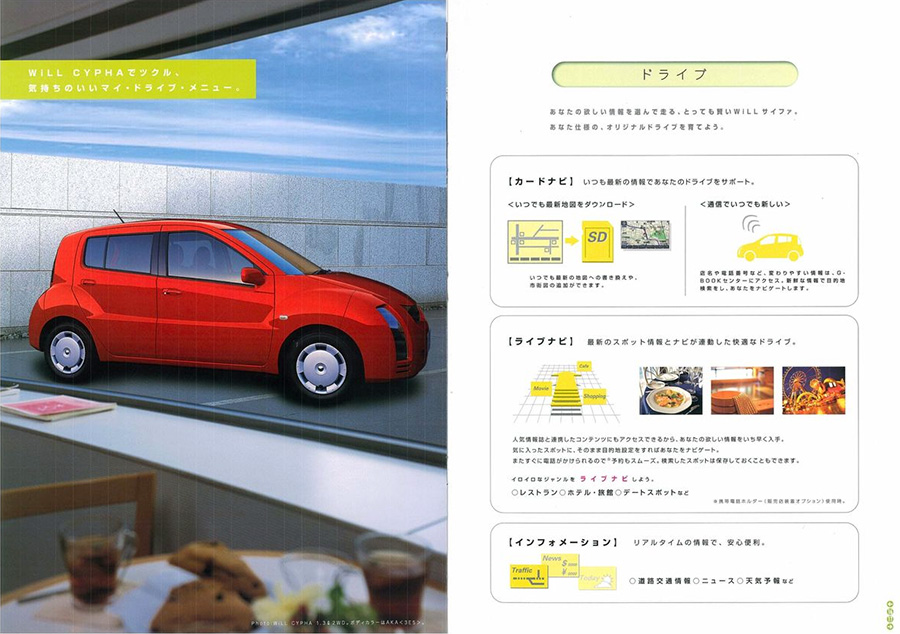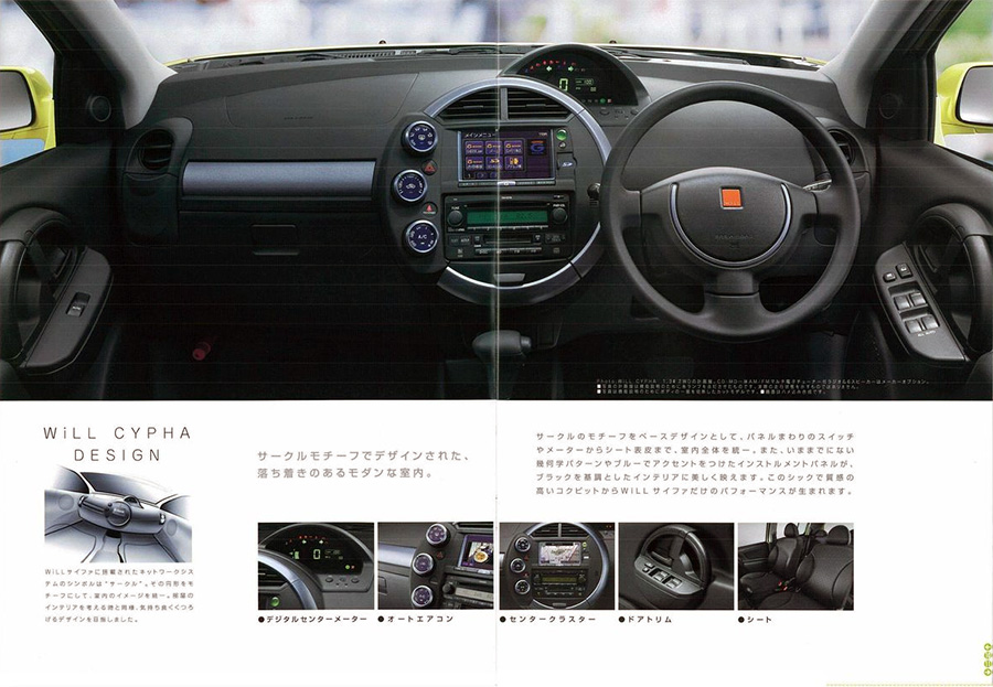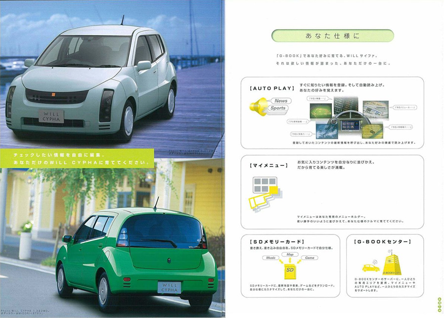 • หน้าจอเทอร์มินัลในรถ: WiLL Cypha ติดตั้งหน้าจอสัมผัสพิเศษที่ออกแบบมาเพื่อ G-Book โดยเฉพาะ แตกต่างจากระบบนำทางทั่วไปในยุคนั้น และแยกออกมาจากชุดเครื่องเสียงของตัวรถเลย