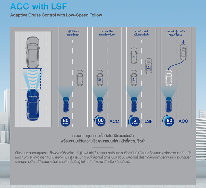 - ระบบควบคุมความเร็วอัตโนมัติแบบแปรผัน พร้อมปรับความเร็วตามคันหน้า Adaptive Cruise Control ACC with LSF Low Speed Following