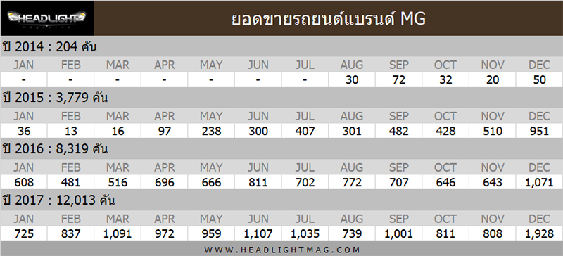- ปี 2017 (มกราคม – ธันวาคม) : 12,013 คัน