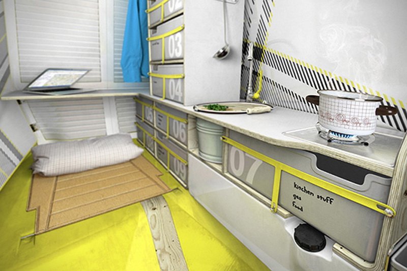 ถังน้ำ, ตู้เย็นขนาดจิ๋ว, และ เตียงนอนพับได้ ซึ่งทั้งหมดล้วนจัดเรียงมาให้ใช้งานง่าย ไม่ดูลำบาก