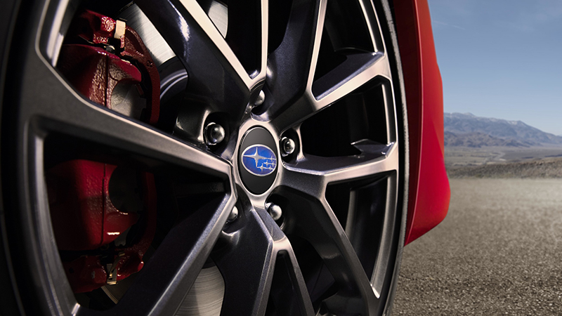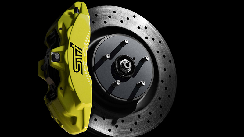 เบรกที่มีขนาดใหญ่ขึ้นของ Brembo ในรุ่น WRX STI จะเพิ่มคาลิปเปอร์เบรกขนาด 6 พอต