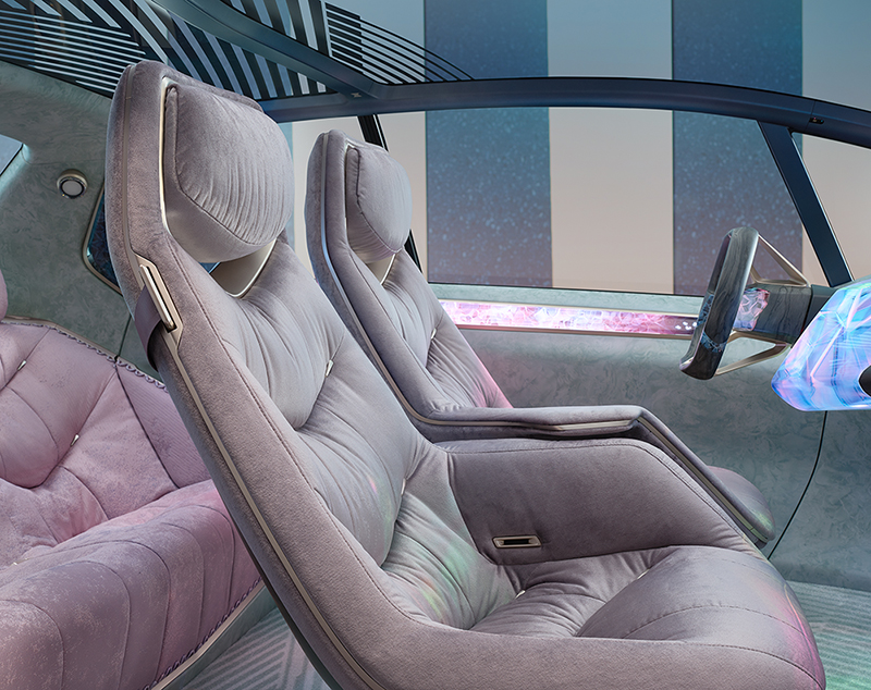 ดีไซน์ของภายในนั้น โดดเด่นด้วยแดชบอร์ดแบบ Floating และไม่มีแผงหน้าปัดแบบทั่วไป แต่ใช้โครงสร้าง 3 มิติ เพื่อแสดงผลต่าง ๆ ในตัวรถ โดยมีเป้าหมายเพื่อลดความจำเป็นในการสร้างวัสดุชิ้นใหญ่แยกย่อยกันแบบระบบ Infotainment ในปัจจุบัน วัสดุที่ใช้ทำภายในเป็นหนึ่งในส่วนสำคัญในการลดปริมาณวัสดุที่ไม่สามารถรีไซเคิลได้ จึงมีการปรับแนวคิดเพื่อที่ใช้วัสดุอย่าง หนังสังเคราะห์ ผ้าใยโพลีเอสเตอร์รีไซเคิล และไม้ก๊อกในการผลิตรถยนต์ขึ้นมา