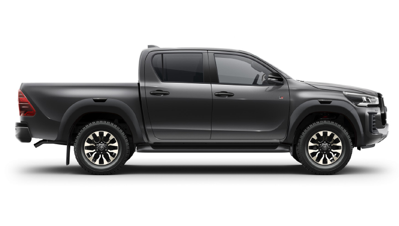 ด้านข้างมีการตกแต่งสัญลักษณ์ GR Sport บริเวณประตูคู่หน้า พร้อมเสริมมาดให้ดุขึ้นด้วยการติดตั้งคิ้วเหนือซุ้อมล้อสีดำด้านคล้ายรุ่น Invincible X อีกทั้งยังเปลี่ยนมาใช้ล้ออัลลอย ขนาด 17 นิ้ว สีทูโทน ที่รัดด้วยยาง All Terrain