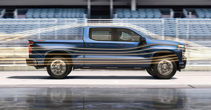 การออกแบบโดยรวม แม้ว่าจะเหลี่ยมจัดแต่ Chevrolet Silverado มีค่าสัมประสิทธิ์แรงฉุดอากาศที่ดีกว่าเดิม 7% ด้วยอานิสงส์ของกระจังหน้าแบบเปิด – ปิดได้ แบบเดียวกับ Chevrolet Camaro ช่วยรีดลมปะทะด้านหน้า ให้ไล่ไปตามเส้นสายตัวถังที่ลากยาวไปบรรจบที่ สปอยเลอร์หลังซึ่งรวมเป็นชิ้นเดียวกับฝากระบะท้าย