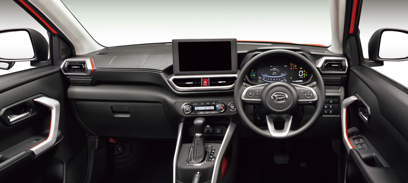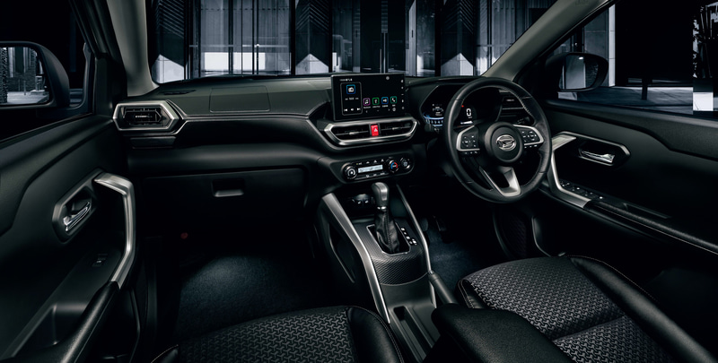 ห้องโดยสารของ Daihatsu Rocky ตกแต่งด้วยสีเงิน Silver Decoration รอบคัน พร้อมใช้วัสดุหนังและบุนุ่ม ให้ภายในดูมีระดับขึ้น คันเกียร์อยู่ในตำแหน่งที่สูง และมีเบาะที่ออกแบบมาให้กระชับกว่าเดิม ช่วยให้ผู้ขับขี่สะดวกสบายยิ่งขึ้น มาตรวัดเป็นแบบดิจิตอล สามารถเปลี่ยนค่าการแสดงได้ 4 รูปแบบ ปิดท้ายด้วยหน้าจอสัมผัสขนาด 9 นิ้ว รองรับการเชื่อมต่อหลากหลายรูปแบบ