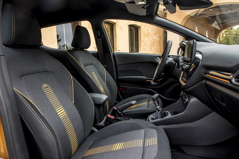 ภายในของ All NEW Ford Fiesta Active มาพร้อมกับเบาะสปอร์ต เดินด้ายสีต่างกัน ตกแต่งรอบห้องโดยสารด้วยวัสดุสีเงิน Satin Aluminum และคอลโซลสีเดียวกับตัวถัง ส่วนพวงมาลัยและหัวเกียร์หุ้มหนังมาให้ นอกจากนั้น วัสดุหุ้มเบาะ, พวงมาลัย และพรมพื้น ยังได้รับการพัฒนามาเป็นพิเศษ ให้ทนสภาพการใช้งานอย่างหนัก และทนต่อรังสี ultraviolet ด้วย