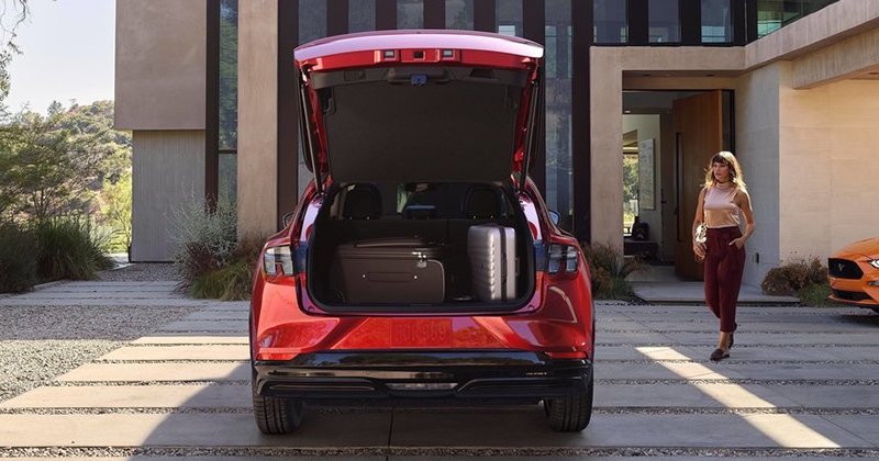 แบตเตอรี่ของ Ford Mustang Mach-E ติดตั้งอยู่ใต้พื้นรถระหว่างเพลาหน้าหลัง ทำให้ภายในไม่โดนผลกระทบจนแคบลง ส่วนความจุพื้นที่บรรทุกสัมภาระหลังเบาะอยู่ที่ 821 ลิตร และเพิ่มเป็น 1,687 ลิตร เมื่อพับเบาะหลังลง ใต้ฝากระโปรงหน้ายังมีที่เก็บของความจุ 135 ลิตร มาพร้อมช่องระบายน้ำด้านล่าง จึงสามารถอัดน้ำแข็งลงไป เพื่อใช้เป็นช่องเก็บความเย็นได้