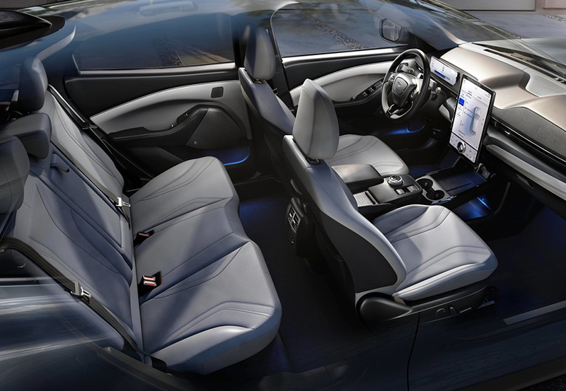 ภายในรองรับผู้โดยสาร 5 ที่นั่ง จัดวางอุปกรณ์มาให้ดูสะอาดตา ด้วยหน้าจอสัมผัสขนาด 15.5 นิ้ว สำหรับควบคุมระบบต่างๆ ภายในรถ รองรับระบบเชื่อมต่อ SYNC รุ่นใหม่ พวงมาลัยเป็นแบบ 3 ก้าน ประทับตรา Pony มาพร้อมมาตรวัดด้านหลัง ขนาดไม่ใหญ่โตมากนัก หลังคาสามารถติดตั้ง Panoramic Sunroof เพิ่มได้ โดยตัวกระจกฉาบสาร infrared มาให้ เพื่อกันความร้อนเวลาแดดออก และกักความร้อนในหน้าหนาว