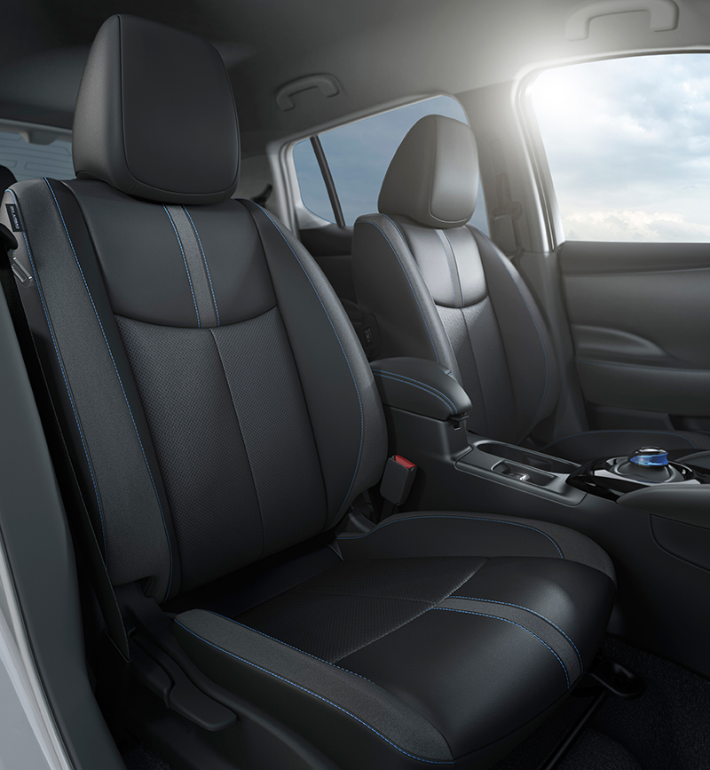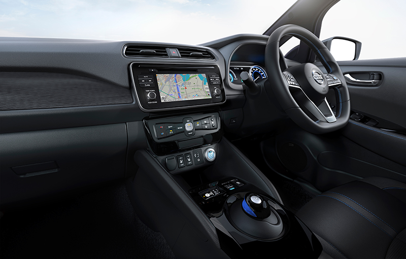 ภายในของ NEW Nissan Leaf ได้รับการออกแบบภายใต้ design language แบบ Gliding Wing ที่เน้นความเรียบง่าย ใช้งานสะดวกและให้ความผ่อนคลาย ตกแต่งด้วยด้ายสีน้ำเงินบริเวณเบาะ, แผงประตู, ที่วางแขน และพวงมาลัย พร้อมปุ่ม push start สีน้ำเงินเพื่อบ่งบอกตัวตนความเป็นรถยนต์ไฟฟ้า