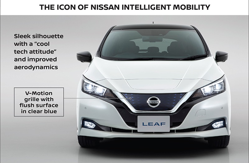 การออกแบบภายนอกของ NEW Nissan Leaf ได้แรงบันดาลใจมาจากรถยนต์ต้นแบบ IDS Concept Car ที่เปิดตัวไปในปี 2015 ตกแต่งด้วยสีนำ้เงินอันเป็นสัญลักษณ์ของรถยนต์ไฟฟ้า โดยนำมาใช้ตกแต่งกระจังหน้าและกันชนหลังด้านล่าง ผสานเข้ากับเอกลักษณ์ของค่าย Nissan คือ
