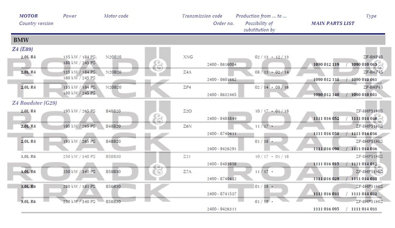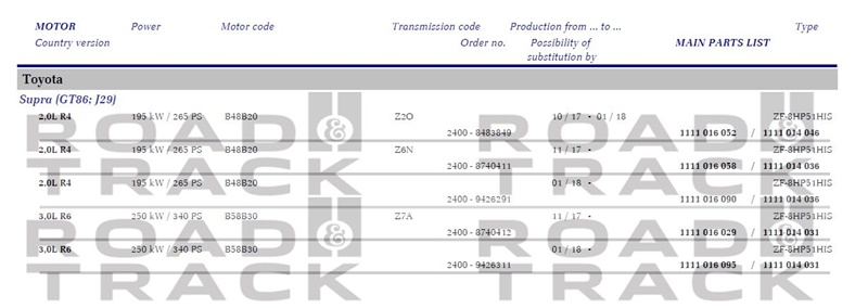 มาเริ่มต้นกับข้อมูลที่หลุดมาจาก ZF กันก่อน ซึ่งเป็นแคตตาล็อกเกียร์สำหรับใช้ภายใน ระบุว่า All NEW Toyota Supra จะมีเกียร์อัตโนมัติ 8 จังหวะ รหัส ZF-8HP51HIS ให้เลือก ส่วนขุมพลังมีด้วยกัน 2 แบบ ดังรายละเอียดต่อไปนี้