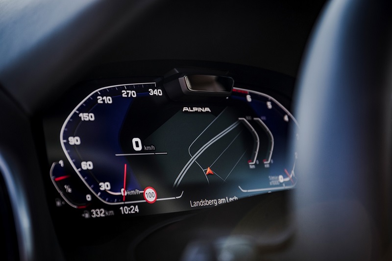 ภายในตกแต่งด้วยวัสดุหนัง LAVALINA ซึ่งเป็นวัสดุธรรมชาติเกรดสูงสุดที่ใช้ในอุตสาหกรรมยานยนต์ ตัดกับสี Walnut Anthracite ซึ่งเป็นเอกลักษณ์ของ ALPINA ก้าน Paddle Shift มาในสีดำเงาทำจากอะลูมิเนียมชิ้นเดียว ปิดท้ายกับเบาะคู่หน้าทรงสปอร์ต multi-functional และ เครื่องเสียง Harman Kardon