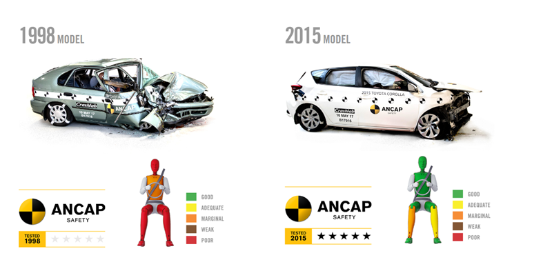 หน่วยงานที่ดูแลความปลอดภัยบนนท้องถนนอย่าง ANCAP ได้โปรโมทแคมเปญใหม่ชื่อ Safer Vehicle Choices Save Lives เพื่อให้ผู้บริโภคตระหนักถึงการตัดสินใจ เลือกซื้อรถยนต์ที่ปลอดภัยกว่า ด้วยการนำเสนอการทดสอบการชนระหว่าง Toyota Corolla Hatchback รุ่นปี 1998 และ รุ่นปี 2015 ให้เห็นไปเลยว่า รถยนต์รุ่นใหม่ให้การปกป้องที่ดีกว่า