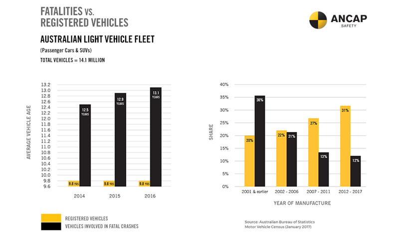 สำหรับอายุรถยนต์ ที่เกิดอุบัติเหตุร้ายแรงโดยเฉลี่ยในปี 2017 อยู่ที่ 13.1 ปี เพิ่มขึ้นจาก 9.8 ปี ในปี 2015 ในทางตรงกันข้าม รถยนต์รุ่นใหม่ที่ผลิตระหว่างปี 2012 – 2017 ซึ่งคิดเป็น 31% ของรถยนต์ทั้งหมดในแดนจิงโจ้ กลับมีส่วนเกี่ยวข้องกับอุบัติเหตุที่มีคนเสียชีวิตในอัตรา 12% เท่านั้น แคมเปญนี้จึงมีเป้าหมายให้ผู้ใช้รถยนต์ เปลี่ยนมาใช้รถยนต์รุ่นใหม่ โดยคำนึงถึงความปลอดภัยที่มากกว่านั่นเอง