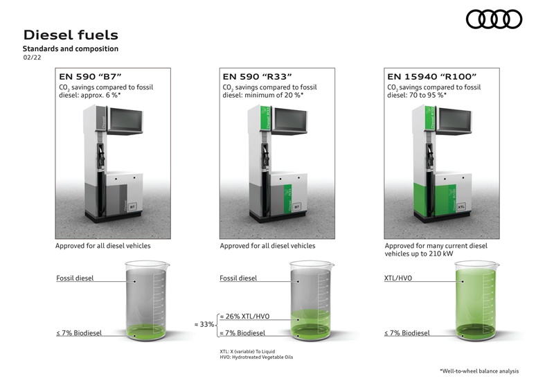 Audi ระบุว่าเชื้อเพลิง HVO สามารถนำมาใช้ได้เลย โดยจะผสมหรือไม่ผสมกับดีเซลก็ได้ ส่วนข้อดีคือลดคาร์บอนไดออกไซด์ลง 70 – 95% เมื่อเทียบกับดีเซลทั่วไป ทั้งยังสตาร์ทเครื่องยนต์ได้ดีกว่าในเวลาที่อากาศเย็น อันเป็นผลจากการที่มีค่า cetane สูง สำหรับรถยนต์รุ่นที่รองรับเชื้อเพลิงชนิดนี้จะติดสติกเกอร์ XTL บนฝาถังเชื้อเพลิง และในเดือนมีนาคมนี้ จะมีการขยายฐานรถยนต์ที่รองรับ HVO ไปยัง Q5 และ A6 Allroad ด้วย
