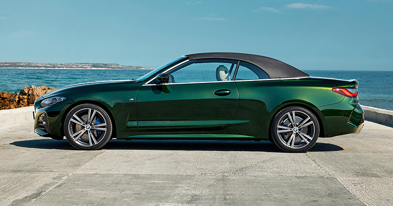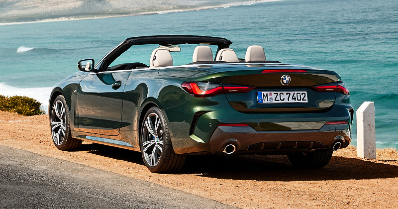 BMW 4 Series Convertible ยังใช้กระจังหน้าไตคู่ขนาดยักษ์เช่นเคย เสริมด้วยไฟหน้า LED บางเฉียบ ทั้งยังติดตั้ง Laserlight เพิ่มได้ หลังคาเป็นแบบผ้าใบ น้ำหนักเบากว่ารุ่นก่อนหน้า 40% เก็บเสียงและกันความร้อนได้ดีขึ้น สีหลังคามาตรฐานเป็นสีดำ แต่สามารถเปลี่ยนเป็นสีเทา Anthracite Silver ได้ หากชอบความสปอร์ต จะมีรุ่น M Sport ให้เลือก ซึ่งจะมาพร้อมกับชุดแต่ง M Carbon และ ล้อ M ขนาด 19 นิ้ว