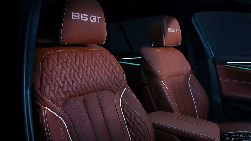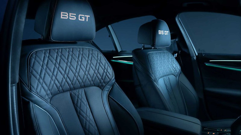 ห้องโดยสารตกแต่งด้วยหนัง Nappa พร้อมลายไม้ Anthracite fine wood เป็นมาตรฐาน แต่สามารถเปลี่ยนเป็นหนัง Full Merino หรือ หนังสีน้ำตาลธรรมชาติ Lavalina ได้ เครื่องเสียงเป็นของ Harman Kardon บ่งบอกความพิเศษด้วยการปักชื่อรุ่น B5 GT บนพนักพิงศีรษะ, โลโก้ชื่อรุ่นทำจากโลหะ และหมายเลขประจำรถบนคอลโซลเกียร์