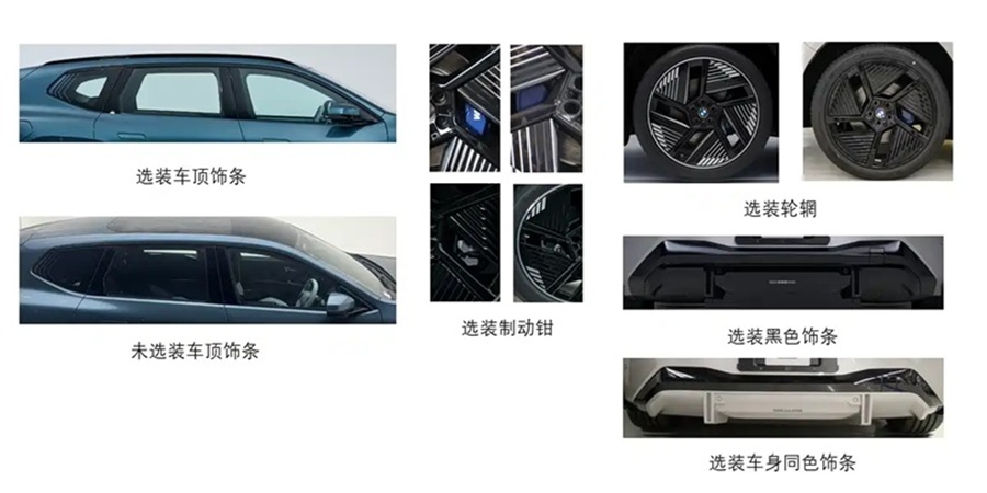 ภายนอกของ BMW iX3 รุ่นฐานล้อยาว ไม่แตกต่างจากเวอร์ชั่นตลาดโลก คงเอาไว้ซึ่งไฟหน้าแบบ Angel Wing พร้อมกระจังหน้าไตคู่เรืองแสงแบบ 3D ไฟท้ายยังคงเป็นแนวนอนรูปทรง L-Shaped พร้อมเสริมมิติด้วยสปอยเลอร์หลังคา มือเปิดประตูเป็นแบบกึ่งซ่อน ตามเกณฑ์บังคับของจีน ตัวถังจะมีให้เลือก 9 สี ล้อมีให้เลือกทั้งขนาด 21 นิ้วพร้อมยาง 255/40 และ 22 นิ้ว พร้อมยางขนาด 255/23 ในด้านหน้า – 275/35 ในด้านหลัง ภายในรองรับผู้โดยสาร 5 ที่นั่ง พร้อมพื้นที่ภายใน ที่กว้างกว่าจากระยะฐานล้อที่มากขึ้น