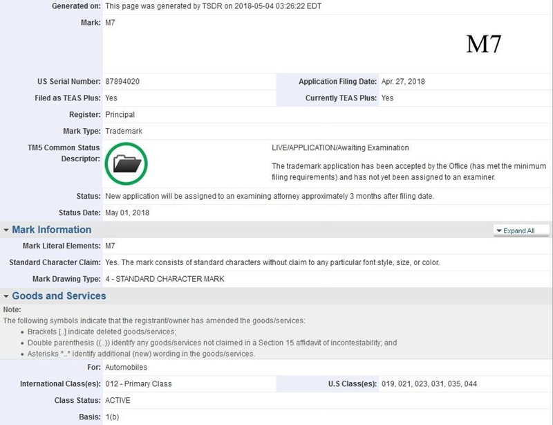 การจดทะเบียนครั้งก่อน ได้รับอนุมัติในวันที่ 24 เมษายน 2012 และหมดอายุในวันที่ 24 เมษายน 2018 ดังนั้น การจดทะเบียน M7 ของ BMW ครั้งล่าสุด จึงเป็นการต่ออายุเท่านั้น โดยมีการส่งคำร้องไปในวันที่ 27 เมษายนที่ผ่านมา และไม่มีการลงรายละเอียดอื่นใด นอกจากระบุเอาไว้ว่า เป็นชื่อไว้ใช้กับรถยนต์เท่านั้น