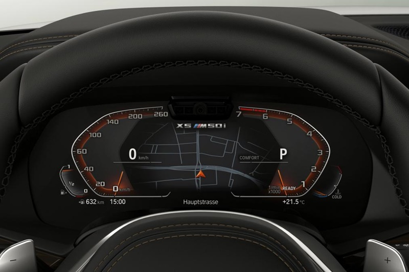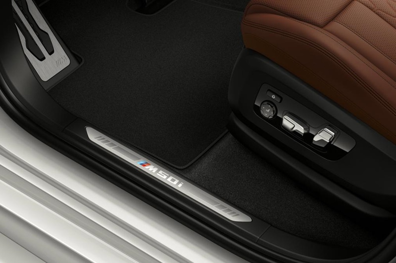 ห้องโดยสารตกแต่งด้วยพวงมาลัย และหัวเกียร์ M เบาะหุ้มหนัง Vernasca เดินด้ายสีตัดกัน ส่วนวัสดุตกแต่งอื่นมีทั้งอะลูมิเนียม Tetragon และลายไม้สีดำ Fineline Black กันเตะประตูเป็นแบบเรืองแสงติดตรา M50i ทั้งยังมีอุปกรณ์เฉพาะรุ่น อย่างใน X5 มีผ้าหลังคา Anthracite พร้อมเครื่องเสียง Hi-Fi ส่วน X7 เปลี่ยนไปใช้ผ้าหลังคา Alcantara Anthracite และเครื่องเสียงจาก Harman Kardon