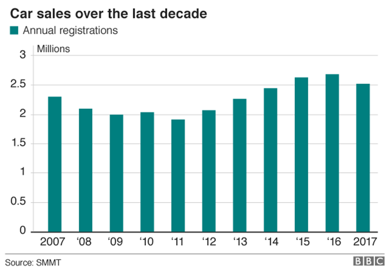 ในปี 2017 ประเทศอังกฤษมียอดขายรถยนต์ราว 2.5 ล้านคัน ต่ำลงจากปี 2016 ราว 5.7% โดยสมาคมผู้ผลิตและผู้จำหน่ายรถยนต์ในประเทศอังกฤษ (Society of Motor Manufacturers and Traders) วิเคราะห์ว่า เหตุการณ์นี้เกิดขึ้นเพราะธุรกิจเข้าสู่ขาลง และผู้บริโภคเกิดความไม่มั่นใจ ซึ่งสืบเนื่องมาจากเรื่อง Brexit นั่นเอง