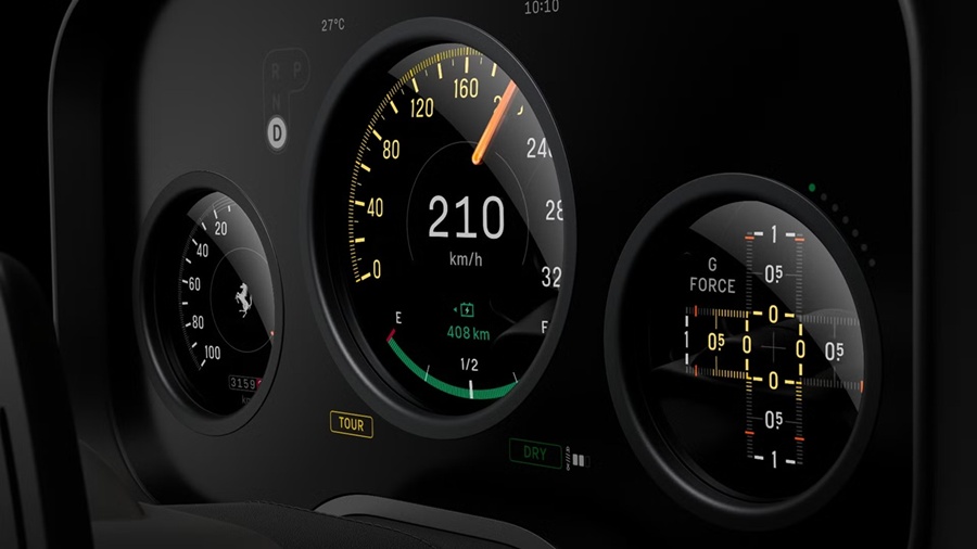 ระบบแสดงผลของ Ferrari Luce เป็นหน้าปัดเป็นแบบสามหลุมกลมพัฒนาขึ้นโดย Samsung Display ที่ประกอบหน้าจอ OLED สองชั้นแบบบางเข้าด้วยกัน ทำให้ดูมีมิติผสานเข้ากับเข็ดวัดที่เป็นเข็มจริง ติดตั้งอยู่บนหน้าจอดิจิตอล เพื่อให้ได้อารมณ์เข็มกวาดสมจริง โดยฝั่งซ้ายเป็น Power Dial แสดงค่าพละกำลังที่ใช้และค่า regenerative braking ส่วนจอกลางแสดงความเร็วและระดับแบตเตอรี่ ส่วนฝั่งขวาเป็น Driver Dial แสดงแรง G-Force, สถานะของระบบต่างๆ, ระยะทางเดินทาง และ แรงดันลมยาง