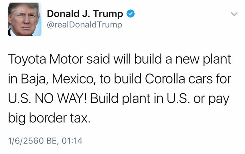 ในสัปดาห์ที่ผ่านมา Donald Trump ได้เขียนข้อความผ่าน Twitter ว่า “Toyota เคยกล่าวว่า