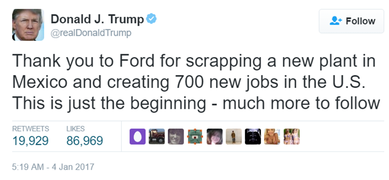 มีเนื้อหาว่า “ขอบคุณ Ford ที่ยกเลิกแผนสร้างโรงงานใน Mexico พร้อมกับสร้างงาน