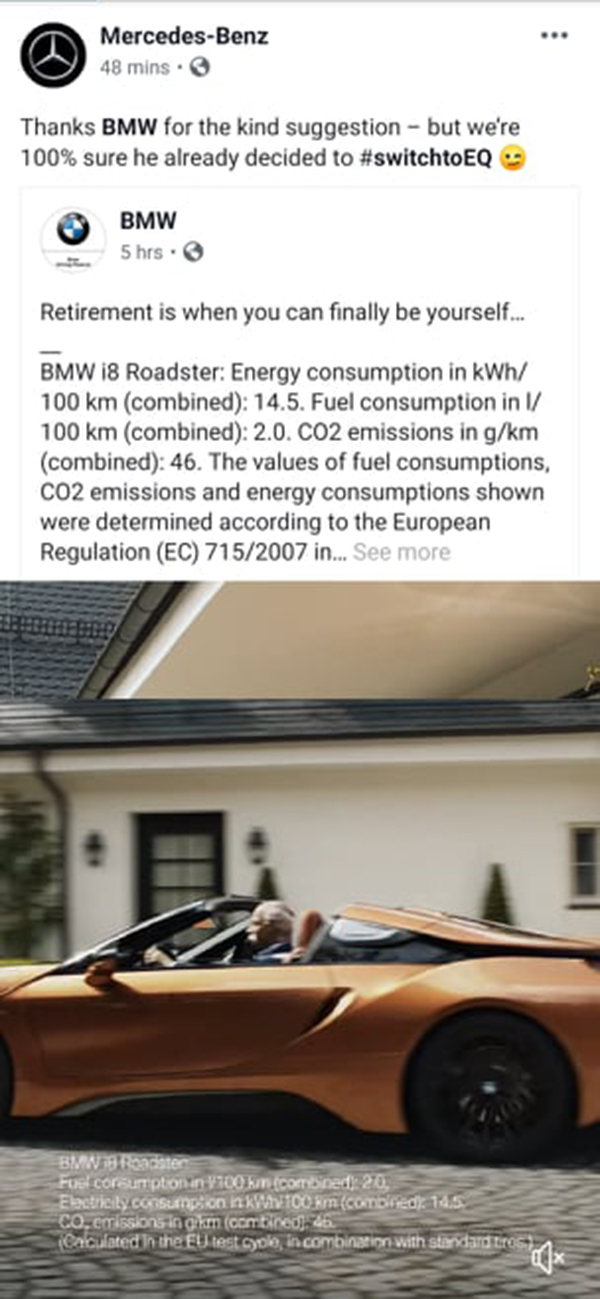 ต่อมาเป็นการลูบหลังของ BMW หลังตบฝั่งตรงข้ามหัวทิ่ม ด้วยการแสดงข้อความ “ ขอบคุณ Dieter Zetsche ในตลอดเวลาที่ผ่านมาหลายปี สำหรับการแข่งขันอันยอดเยี่ยม ” หลังการเผยแพร่วีดีโอนี้ไม่กี่ชั่วโมง Official Page ของ Mercedes-Benz ได้แชร์วีดีโอดังกล่าวจาก page ของ BMW โดย post ข้อความว่า “ ขอบคุณ BMW สำหรับคำแนะนำนะ แต่เรามั่นใจว่าเขาเลือกใช้ EQ มากกว่า ” พร้อมปิดท้ายด้วย emoji แลบลิ้น