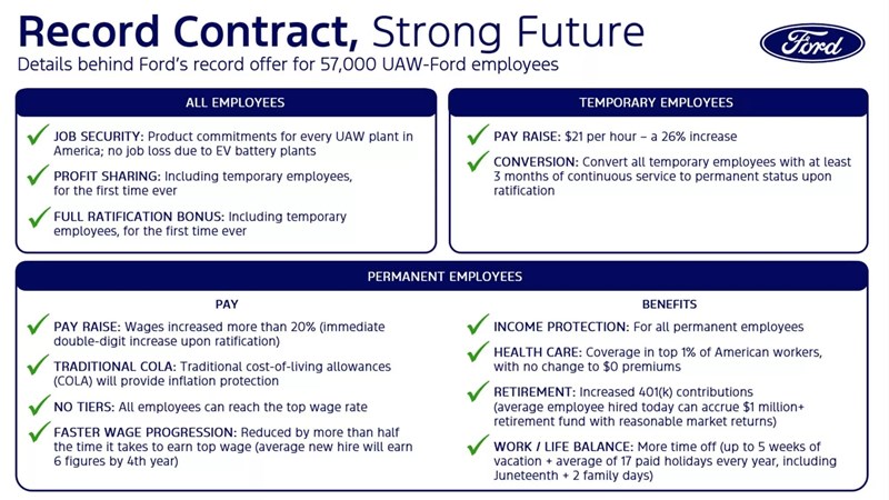 หลังจากที่มีการประท้วงของกลุ่มสหภาพแรงงานยานยนต์ UAW หรือ United Auto Workers ไปทั่วสหรัฐฯ ล่าสุด ดูเหมือนว่า Ford จะบรรลุข้อตกลงกับ UAW เรียบร้อยแล้ว พร้อมประกาศมาตรการเพิ่มผลตอบแทนหลายรายการให้พนักงานของ Ford ทั้ง 57,000 ราย ในสหรัฐฯ โดยไม่ได้สงวนสิทธิ์เฉพาะพนักงานประจำเท่านั้น แต่หลายปัจจัยได้มอบให้กับพนักงานสัญญาจ้างเป็นครั้งแรกอีกด้วย ดังรายละเอียดต่อไปนี้